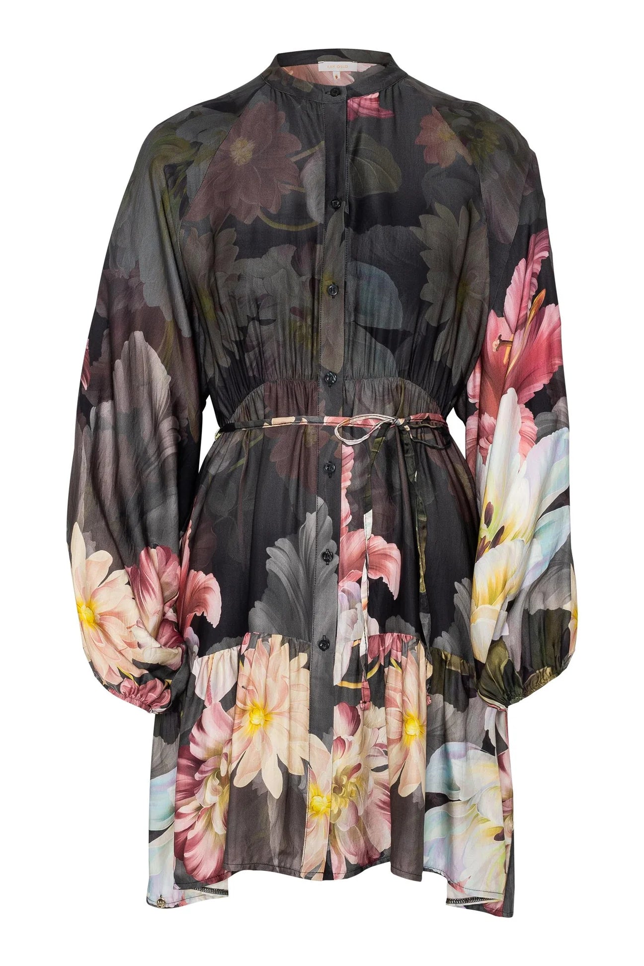 Denne vakre kjolen har et flott blomsterprint mot mørk bakgrunn. Kjolen rekker til rett over knærne. Den har ballongermer, knyting i livet og knappestolpe helt ned.