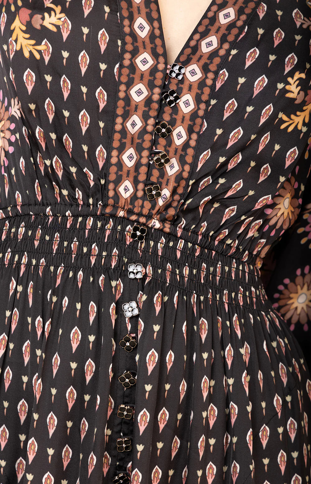Vakker kjole med flott blomsterprint. Kjolen har lange ermer med elastiske mansjetter. Den har knapper i front som rekker hele veien ned, knappene er funksjonelle i kun topp og bunn. I sidene har kjolen lommer.